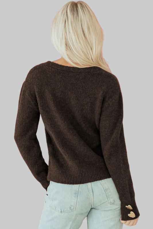 Chicory Coffee Heart Metal Button V Neck Cardigan Sweater