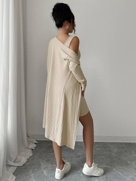 Ribbed V Neck Ribbon Bow Back Drop Shoulder Long Sleeve Top