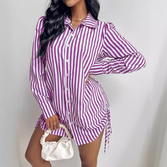 Striped Long Sleeve Lapel Shirt Dress